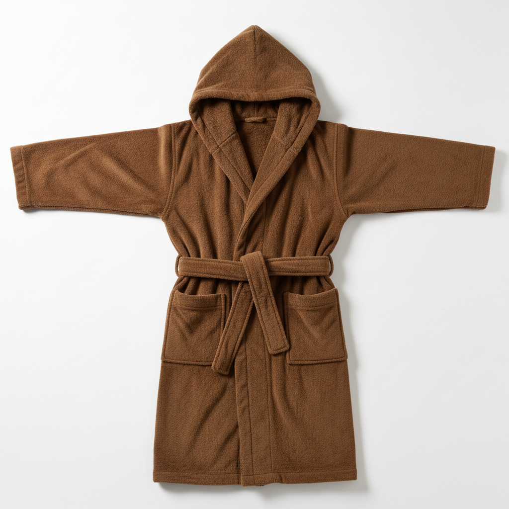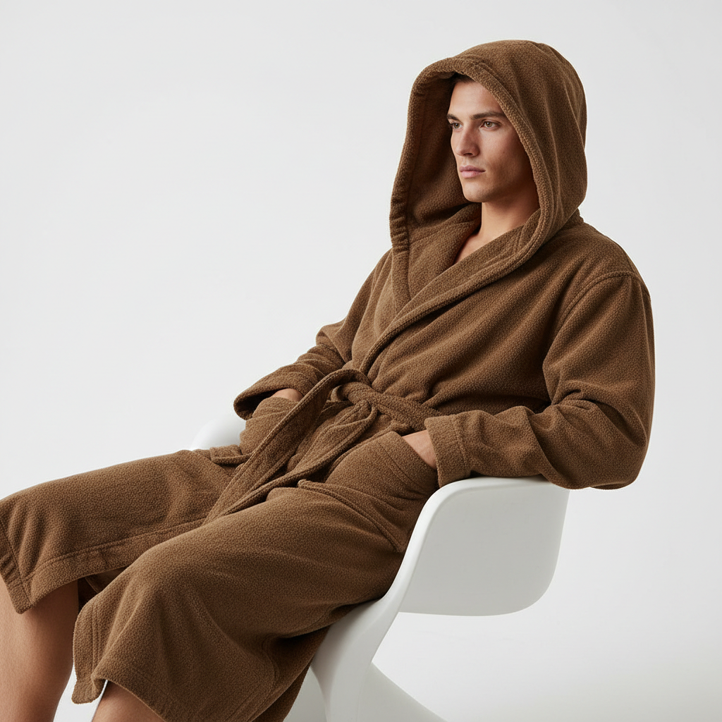 Тёплый коричневый халат с капюшоном для расслабленного домашнего отдыха.