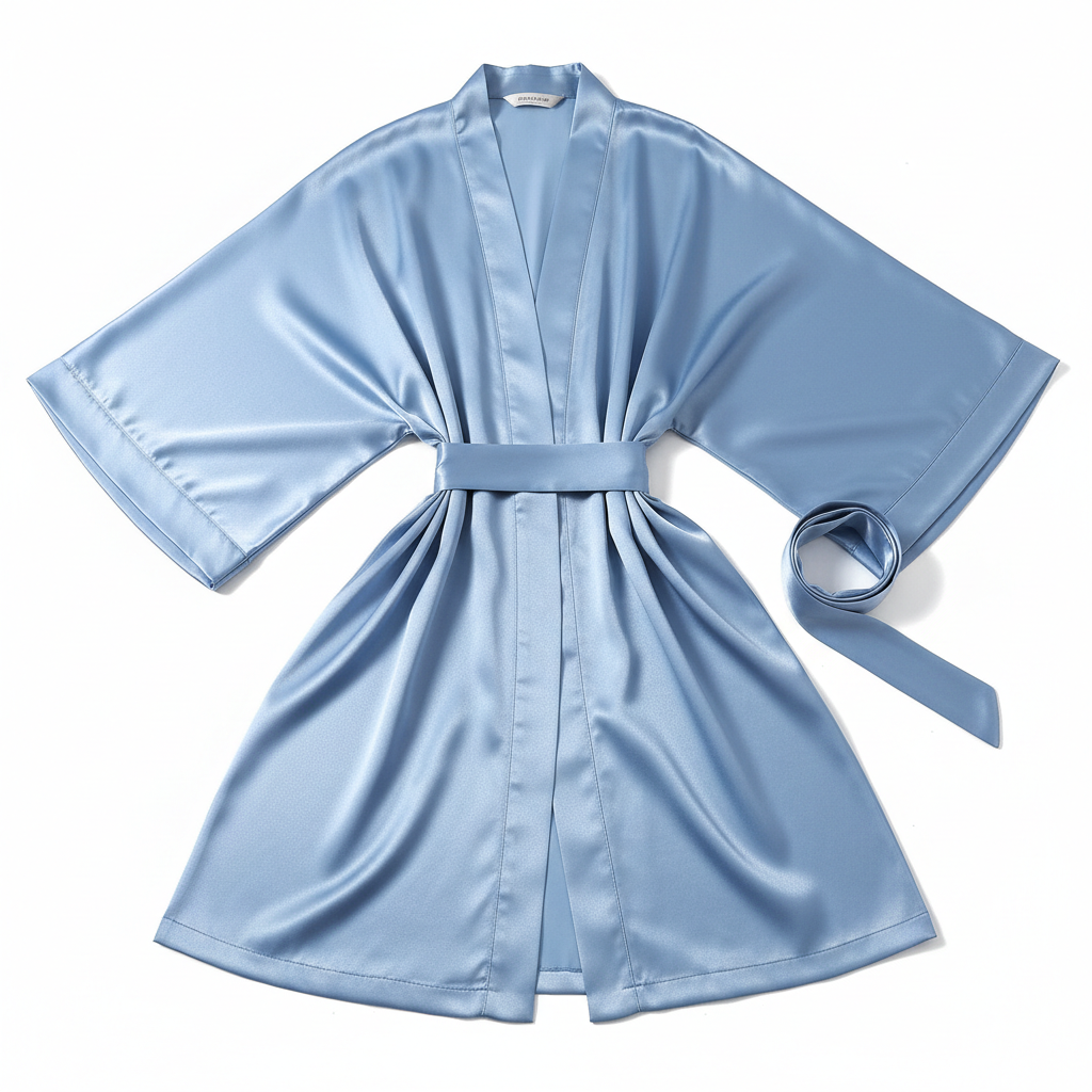 Нежный голубой шелковый халат, лёгкий и приятный к телу, создающий ощущение роскоши и комфорта.