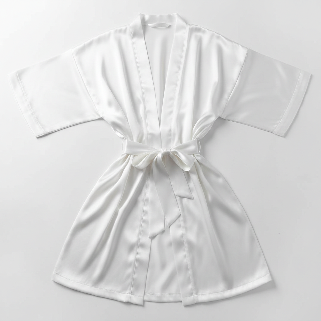 Элегантный белый шелковый халат, лёгкий и гладкий на ощупь, дарящий комфорт и ощущение роскоши.