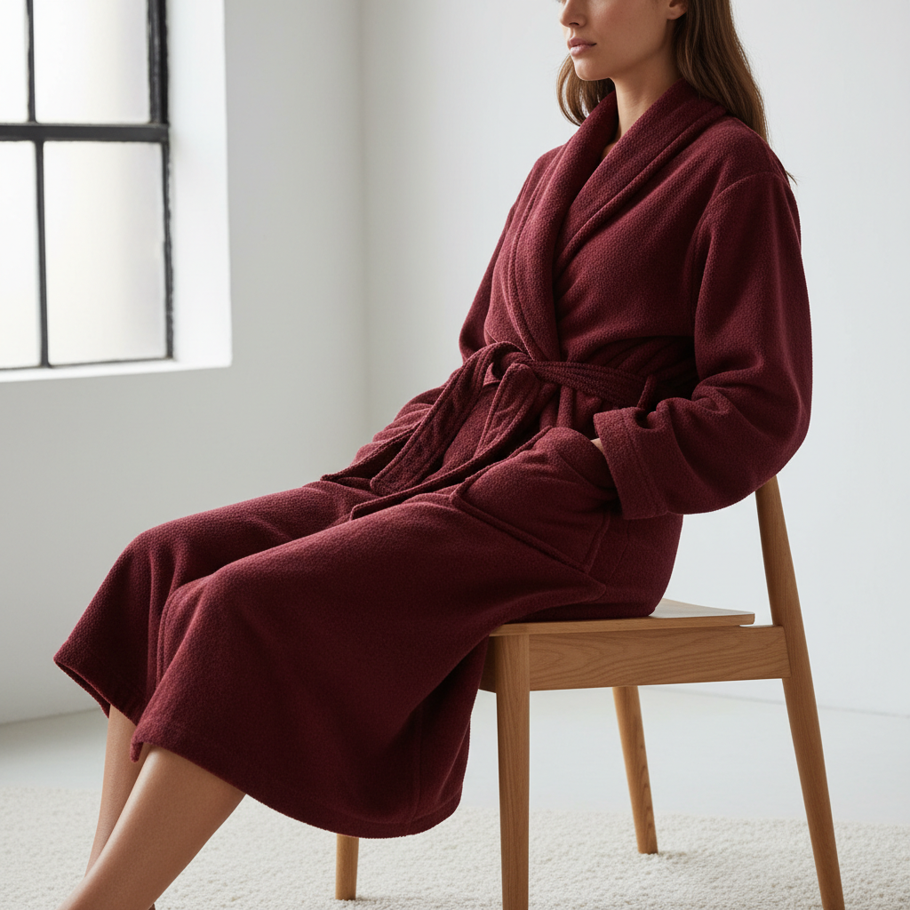 Стильный бордовый махровый халат, мягкий и уютный для домашнего комфорта.