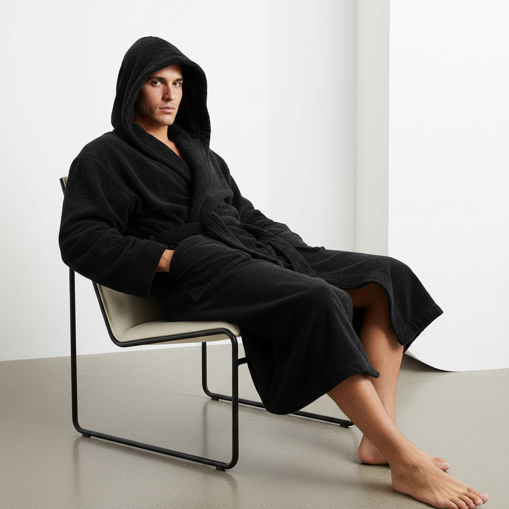 Элегантный черный махровый халат, приятный к телу и идеально подходит для дома.