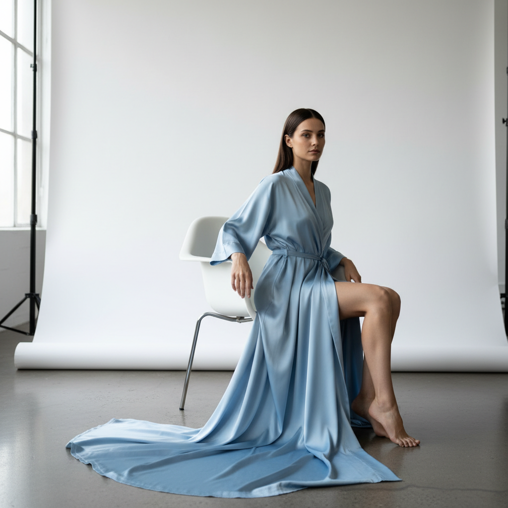 Нежный голубой шелковый халат, лёгкий и приятный к телу, создающий ощущение роскоши и комфорта.