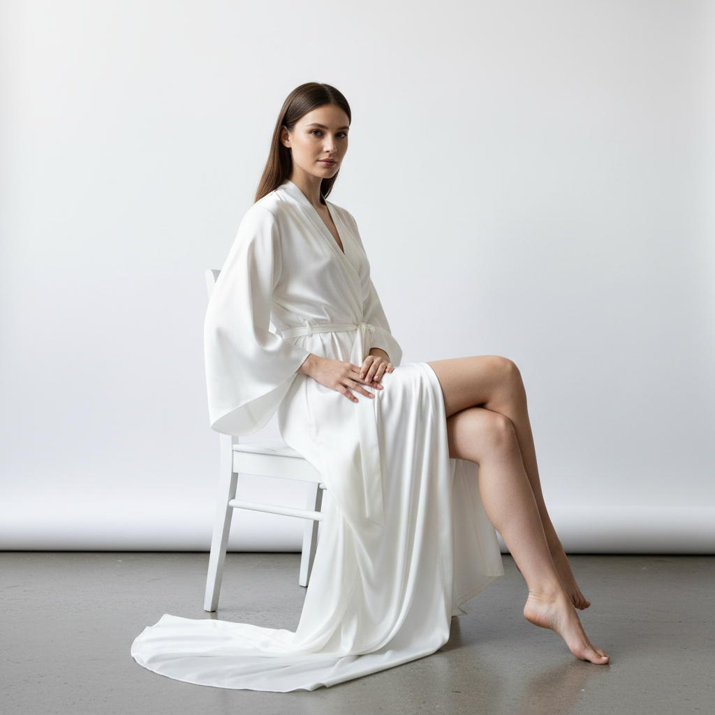 Элегантный белый шелковый халат, лёгкий и гладкий на ощупь, дарящий комфорт и ощущение роскоши.