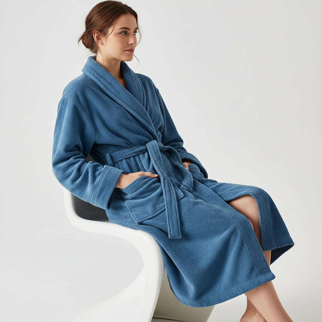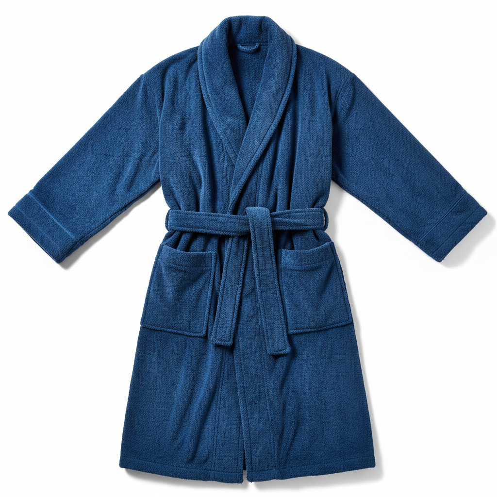 Мягкий синий махровый халат, уютный и комфортный для дома и отдыха.