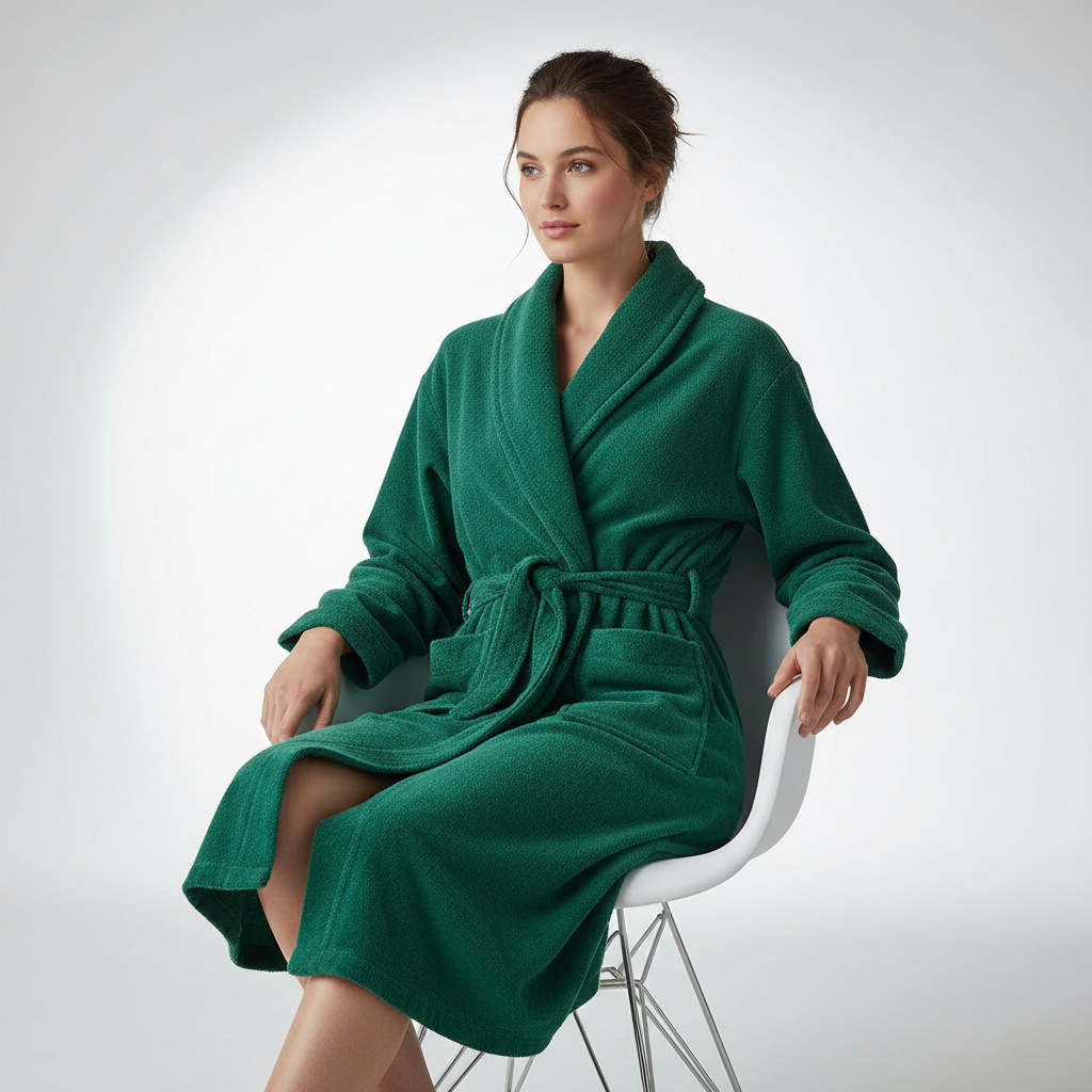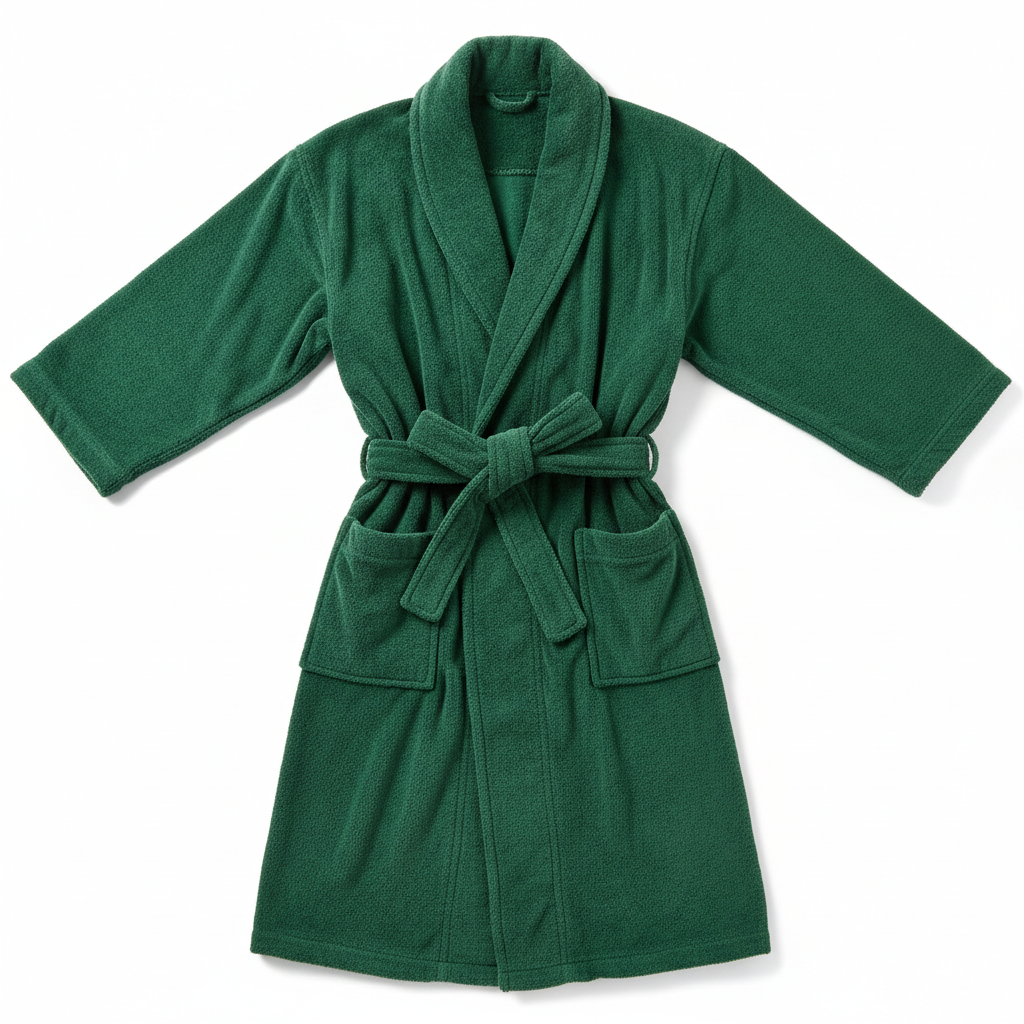 Уютный зеленый махровый халат, мягкий и тёплый, идеально для комфортного отдыха.